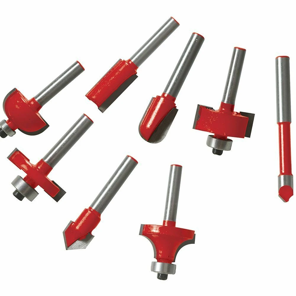 – Includes: Mortice: D12.7mm; Combi bevel: D12.7mm; Dovetail: D9.5 & 12.7mm; 90deg grooving: D12.7mm; Round nose: D9.5 R4.76mm & D12.7 R6.35mm; Trimming: D22mm; Panel pilot: D6.35mm; Straight: D6.35, 9.5, 12.7 & 19.05mm; Bearing flsh trim: D12.7mm; Round over: R3.17 D19.05mm, R4.76 D22.2mm, R6.35 D25.4mm, R95 D31.7mm; Cove: R6.35 D22.2mm, R9.52 D28.6mm; Roman ogee: R3.96 D25.4mm; 45deg chamfer: D30mm; Slot cutter: D6.35mm; Rabetting D12.7mm.